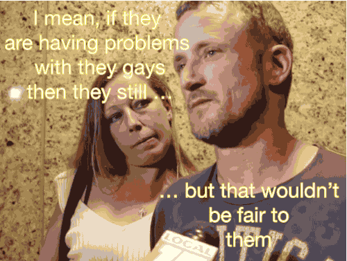 The interviewer basically asks how they feel as taxpayers not being able to conduct a regular state function like getting married.