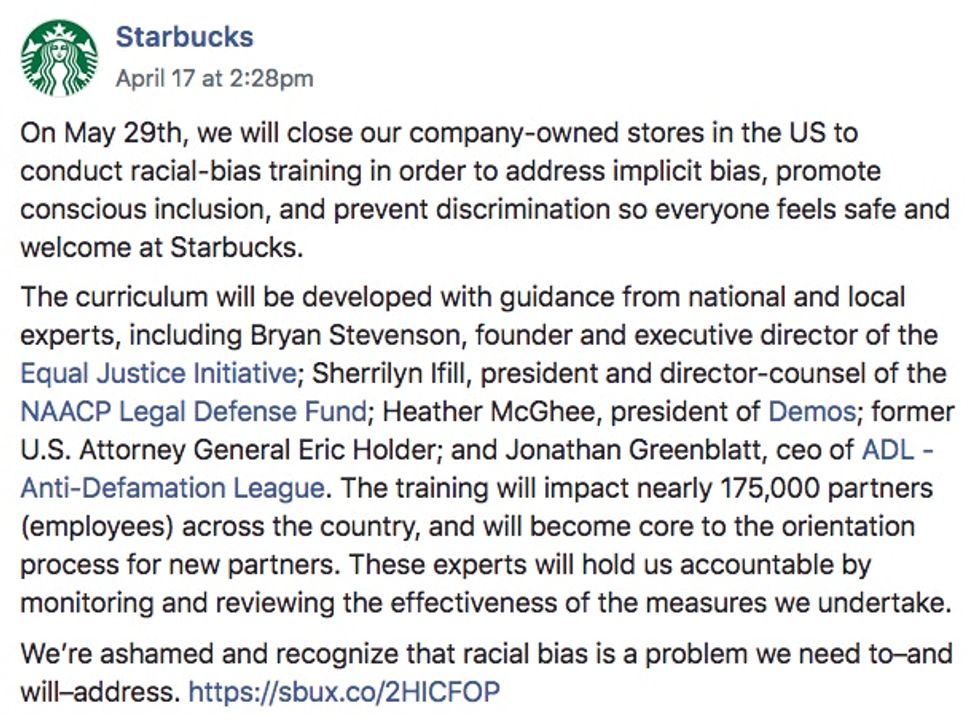 Responding to criticism arguing that the Philadelphia incident was just a few bad apples, the company replied, "Because systemic racism and bias is bigger than one partner, one store or one company. We are shutting our stores for this training because we recognize that we have the responsibility to be part of the solution."