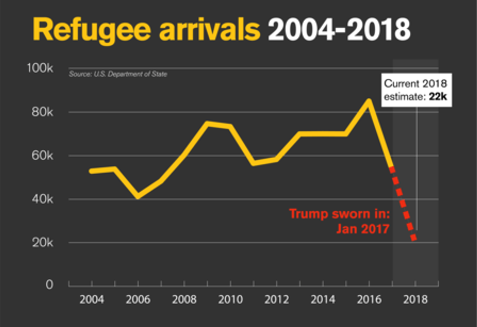 While those numbers have increased, the number of refugees the U.S. accepts has been drastically reduced. Obama set the refugee ceiling at 110,000 for 2017, but Trump cut that limit to 45,000 in 2018 — the lowest in decades. And according to the International Rescue Commission, the U.S. is on track to only take in around 22,000 this year — less than half of the limit. For perspective, that's approximately one refugee for every 15,000 Americans.