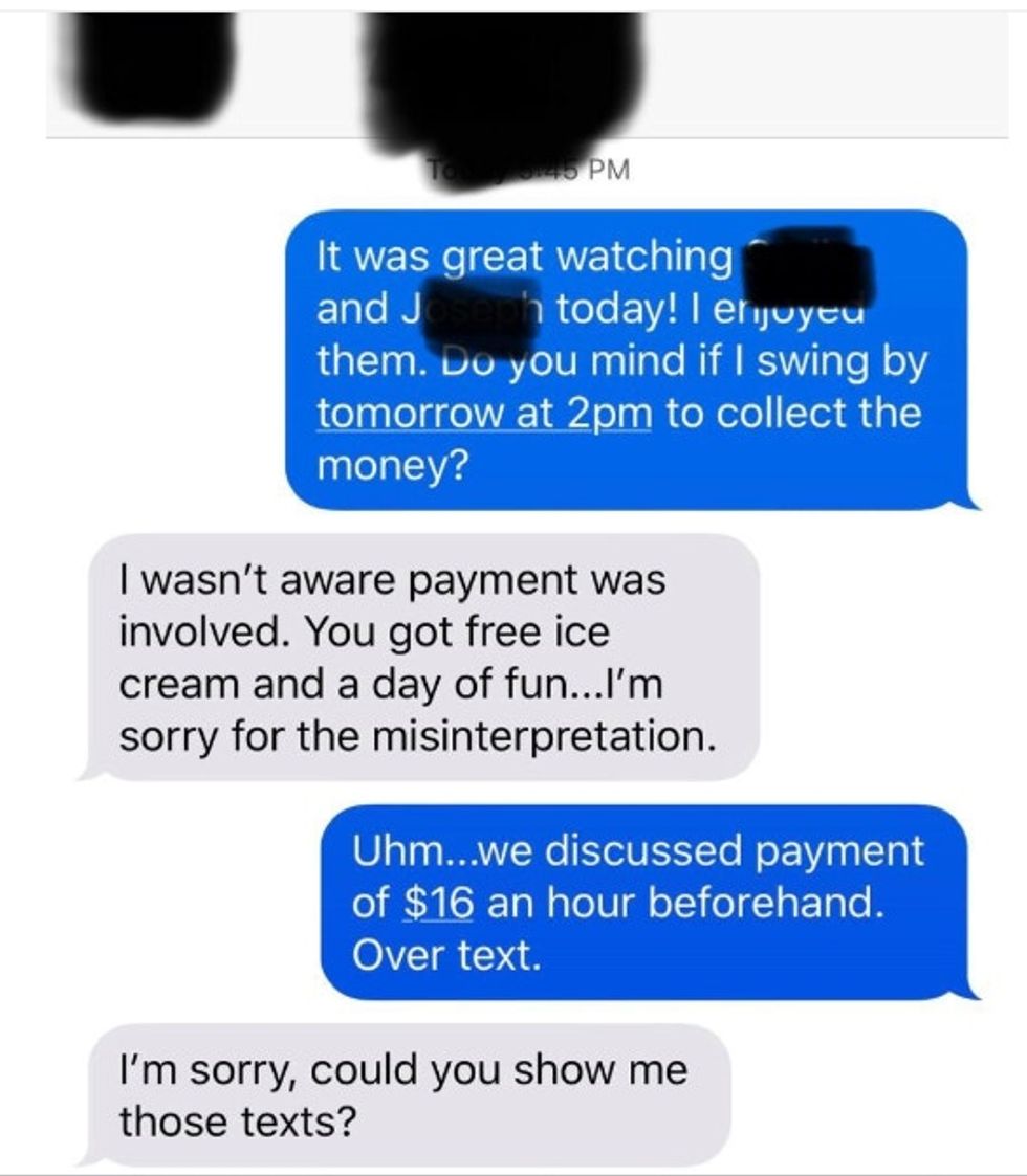 Yup. She tried to pass off "free ice cream" and "a day of fun" as a form of payment. Luckily, the babysitter has screenshots.