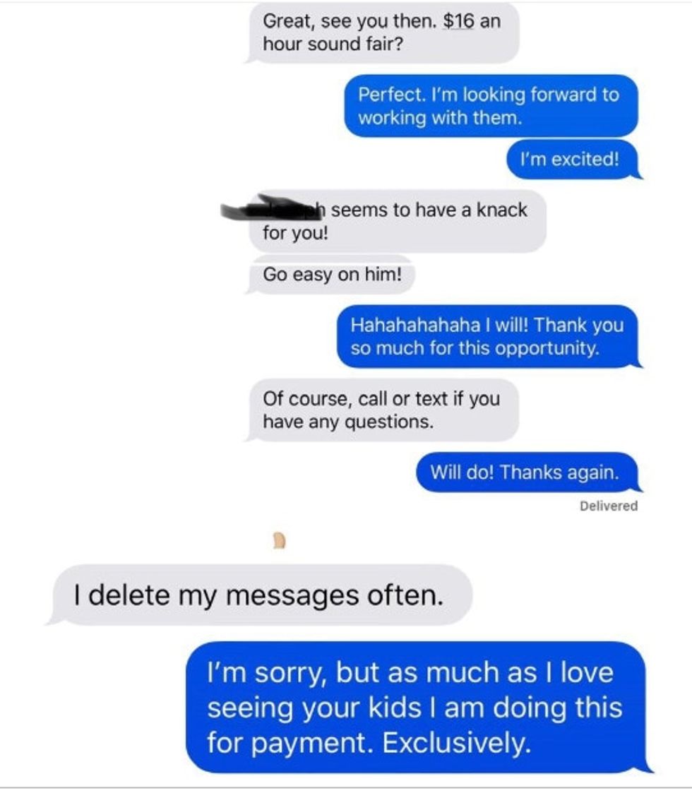 Babysitting is a job and many parents forget that the product of their composite DNA doesn't bring as much joy for everyone else on the planet as it does for them. Originally shared on Reddit, the mom clearly agrees to pay the babysitter $16 per hour.