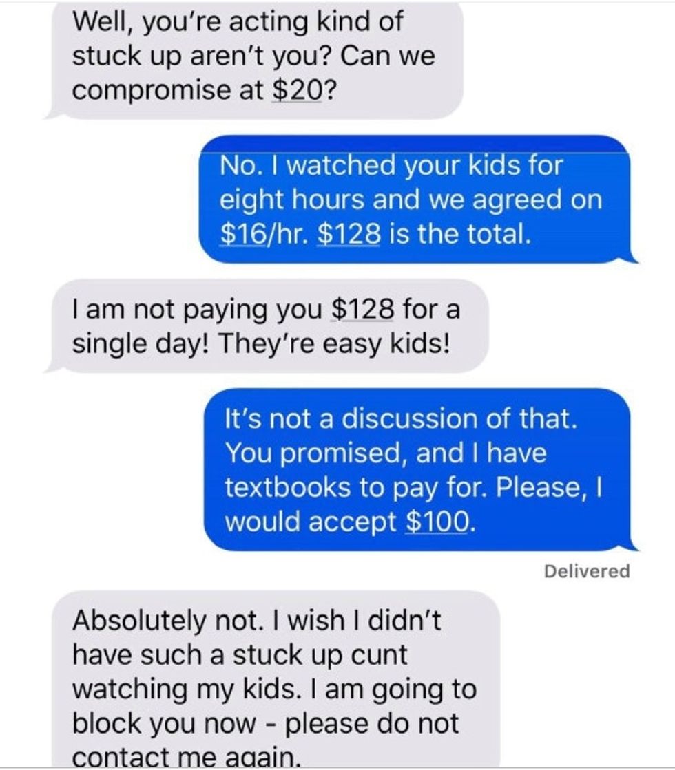 The final text message was not delivered because the mom blocked the babysitter, as people who are trying to steal tend to do. I'm not even going to try to unpack her dropping the C-word on this poor babysitter before the block like the passive aggressive coward she is.