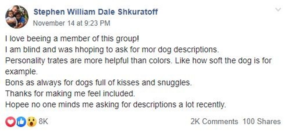 "I love being a member of this group!" wrote Shkuratoff. "I am blind and was hoping to ask for more dog descriptions. Personality traits are more helpful than colors. Like how soft the dog is, for example. Bonus as always for dogs full of kisses and snuggles.
