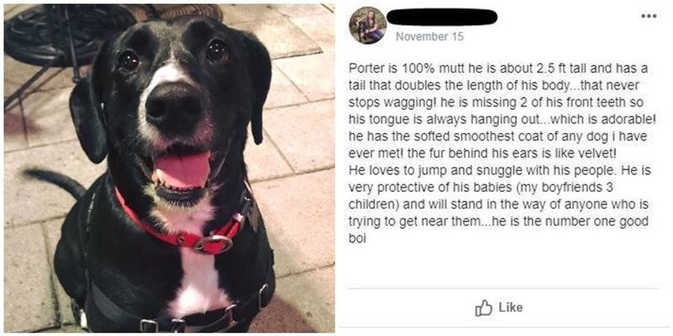 Porter is 100% mutt he is about 2.5 ft tall and has a tail that doubles the length of his body...that never stops wagging! he is missing 2 of his front teeth so his tongue is always hanging out...which is adorable! he has the softed smoothest coat of any dog i have ever met! the fur behind his ears is like velvet!He loves to jump and snuggle with his people. He is very protective of his babies (my boyfriends 3 children) and will stand in the way of anyone who is trying to get near them...he is the number one good boi