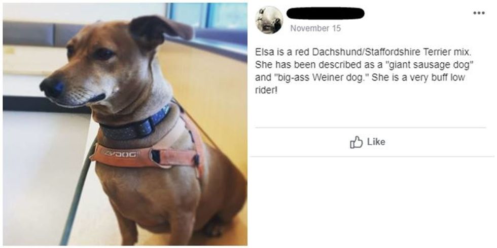 Elsa is a red Dachshund/Staffordshire Terrier mix. She has been described as a "giant sausage dog" and "big-ass Weiner dog." She is a very buff low rider!
