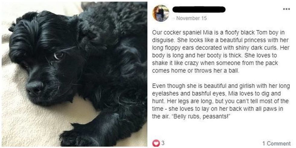 Our cocker spaniel Mia is a floofy black Tom boy in disguise. She looks like a beautiful princess with her long floppy ears decorated with shiny dark curls. Her body is long and her booty is thick. She loves to shake it like crazy when someone from the pack comes home or throws her a ball.
