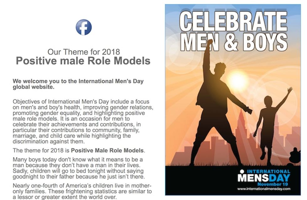 Guess what, though: Despite the fact that International Men’s Day — like Heterosexual Pride Month and White History Month — are celebrated on a daily basis, International Men’s Day really does exist; it’s Nov. 19. There’s a website and everything. (If you need a head start, 2018’s theme is "Positive Male Role Models.")