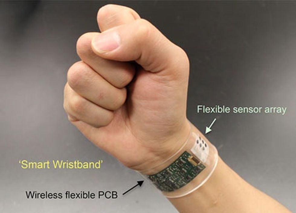 It has sensors that discern the sodium, potassium, glucose, and lactate levels in a person's sweat. They connect to a circuit board on the band that calculates the data and sends it to a laptop or smartphone.