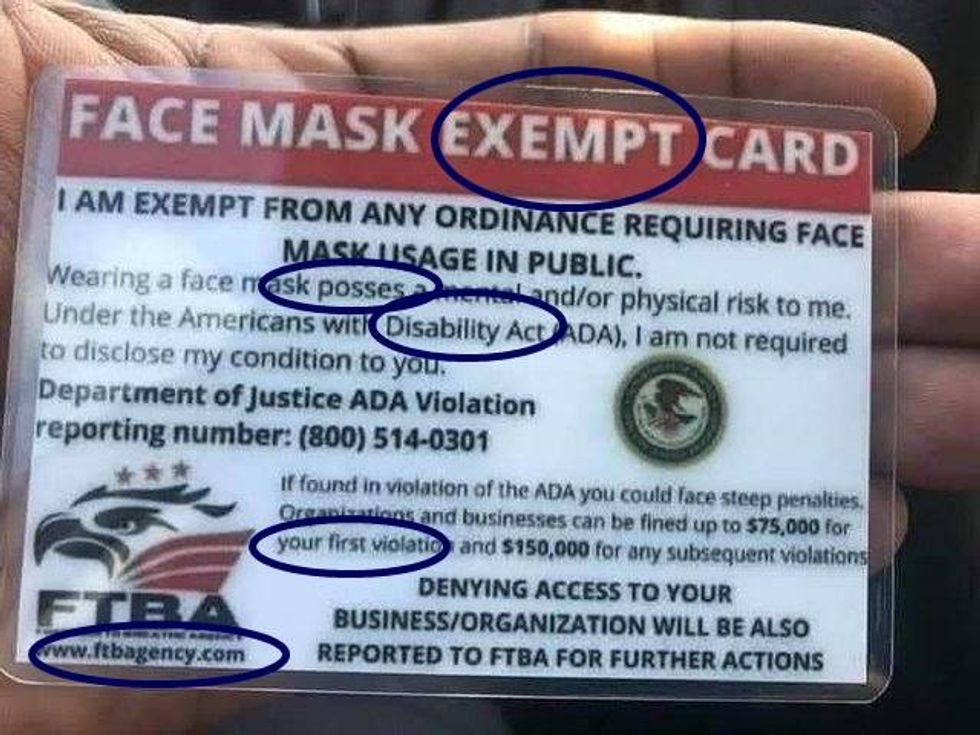 "I am exempt from any ordinance requiring face mask usage in public. Wearing a face mask poses a mental and/or physical risk to me. Under the Americans with Disability Act (ADA), I am not required to disclose my condition to you," the card reads.