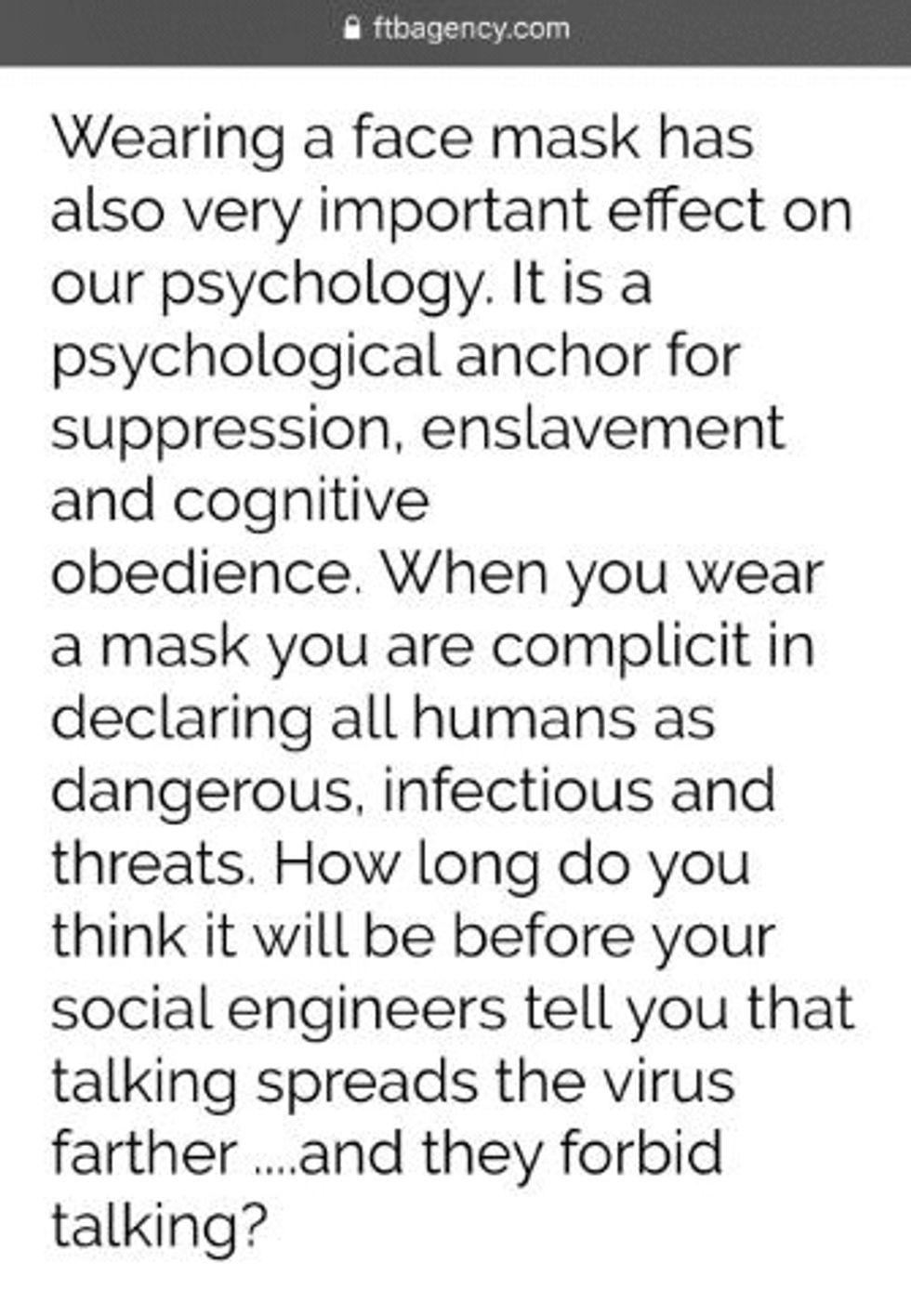 Wearing a mask not only prevents people from catching COVID-19 but from spreading the deadly disease as well. So the Freedom to Breathe Agency are willfully deciding to put the health of others in danger because they aren't smart enough to know or they just don't care.