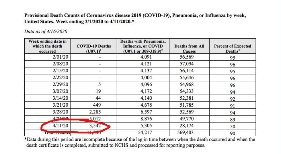This is a screenshot of the Provisional Death Count as of April 16, 2020 (which you can access at this CDC link). As you can see, the COVID death count for the week of 4/11/20 was 3,542.