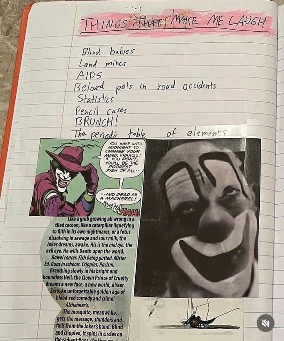 There is, of course, quite a bit of dark, disturbing things scribblings in there, like listing “blind babies” and “AIDS” under “things that make me laugh,” all of which leaves clue as to how Ledger was able to authentically drop into a chaotic and twisted mind.