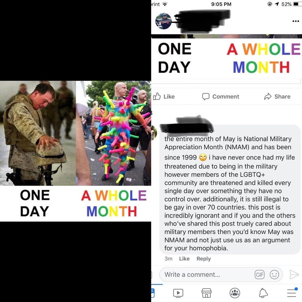 After pointing out that being gay is still illegal in many, many places around the world (even in the US, we're still fighting for federal protection from discrimination in all 50 states), the author closed with this: "This post is incredibly ignorant and if you'd and the others who've shared this post truely [sic] cared about military members then you'd know May was NMAM and not just us as an argument for your homophobia."