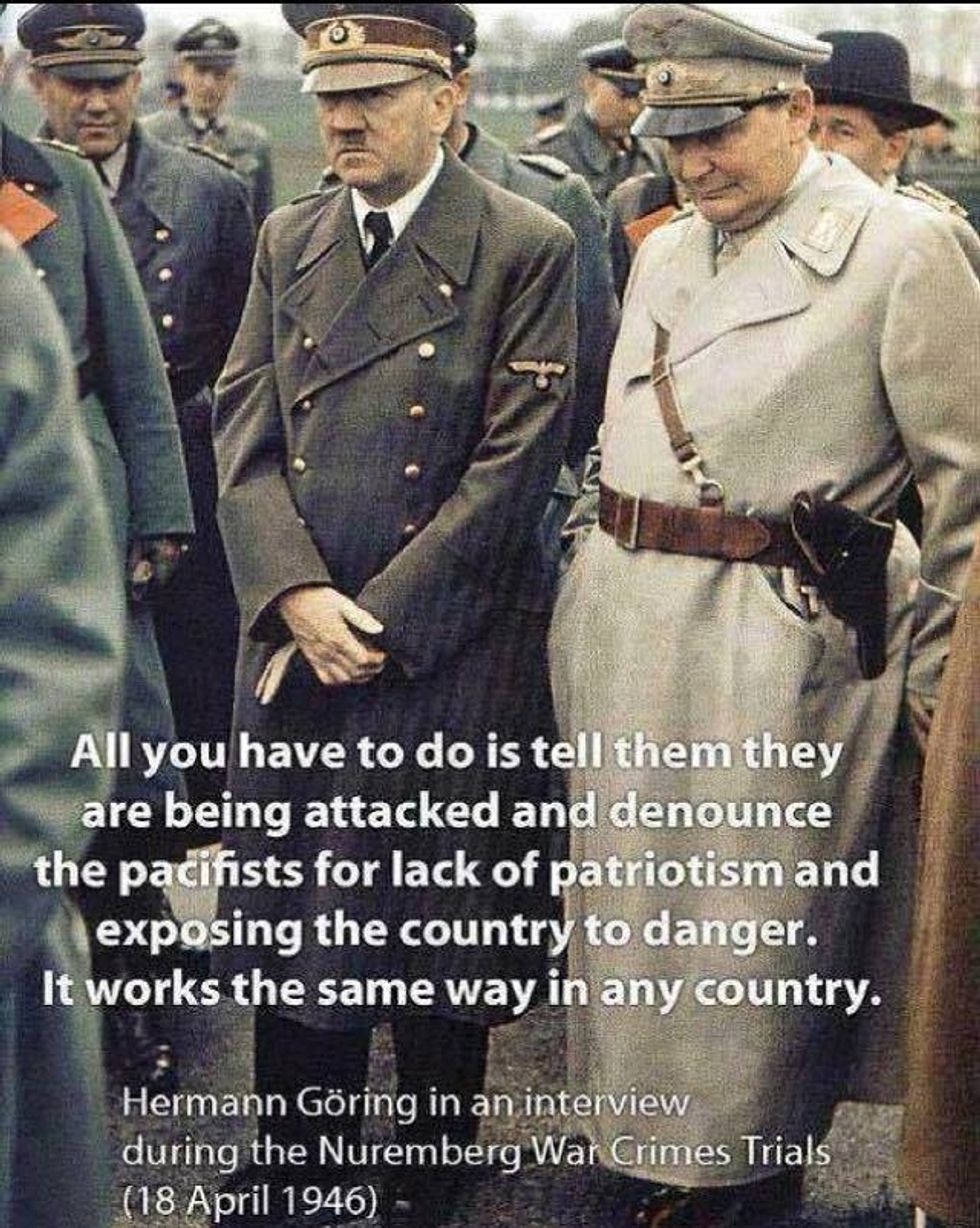 The quote comes from a published account of a private conversation with a renowned psychologist, in which Goering explained how “people can always be brought to the bidding of the leaders.”