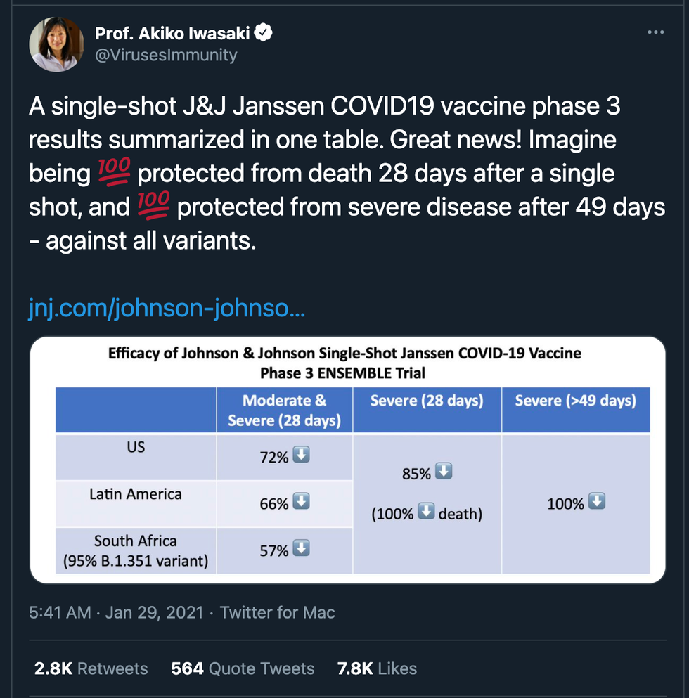 "Johnson & Johnson's single-dose Covid-19 vaccine was 66 percent effective at preventing moderate and severe disease in a global study" – Politico