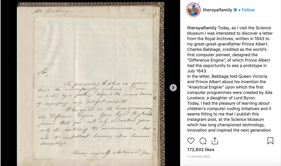 The Queen posted two photos of a letter to Prince Albert from Charles Babbage with a caption. "Today, as I visit the ScienceMuseum I was interested to discover a letter from the Royal Archives, written in 1843 to my great-great-grandfather Prince Albert,"theQueen wrote in her post.
