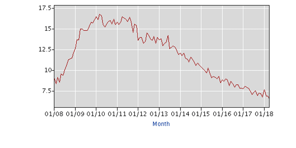 The same goes for Hispanic unemployment. Yes, it's the lowest it's been in 25 years, but it's also been steadily dropping since 2011: