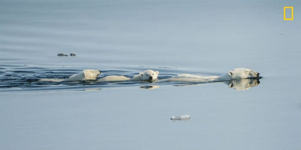 "We spotted this mama and her two cubs swimming along the ice sheets in search of food."