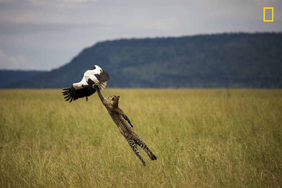 "One shot capture. I watched the leopard stalking the stork. I only had time to focus at 400mm — no time to change to high speed. I watched the stork and as soon as it flapped its wings, I shot one shot."
