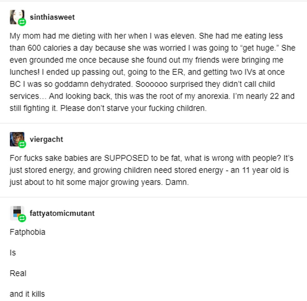 Another person wrote about how her mother had her dieting with her from the time she was 11, worried she was going to "get huge." She fed her less than 600 calories per day and grounded her when she found out her friends were bringing her lunches. She ended up in the ER and has struggled since with anorexia. "Please don't starve your fucking children," she wrote.