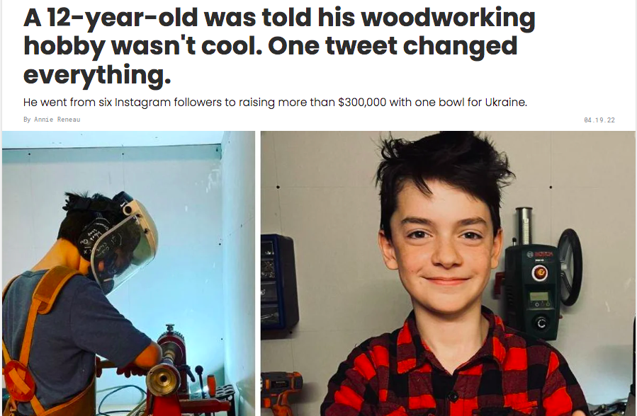 Best story ever. Gabriel Clark’s dad shared that his son was feeling down because kids had told him his woodworking habit wasn’t cool. That tweet resulted in a flood of support and prompted Gabriel to create a special wooden bowl to raise money to help the children of Ukraine. So many people pulling together to support a sweet kid and those impacted by war. Definitely worth reading the whole story here.