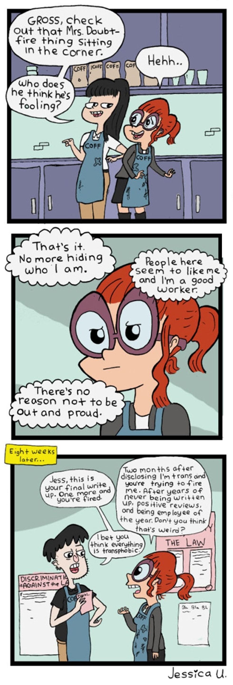 "Everyone made me feel like it was all my fault, like transphobia inside them simply couldn't exist because they pledged their support for me at one point," she says. "I really started to believe that I turned into the awful person and worker many said I become. But when I started drawing the comics about transphobia, other trans people responded immediately, saying that they've been through a lot of the same stuff."