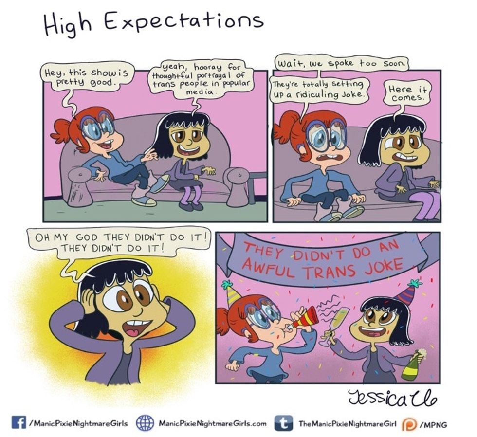 It seems like just every few weeks a major media outlet in the U.S. or Europe will publish some variation on "What Makes a Woman?" or "Are Trans Activists Going Too Far?" The totally bizarre thing is that these stories tend to use the same arguments over and over and over and — well, you get the idea. It's pretty frustrating to have your existence talked about as an abstract hypothetical when there are so many very important, real things happening in the world. Comic by Manic Pixie Nightmare Girls.