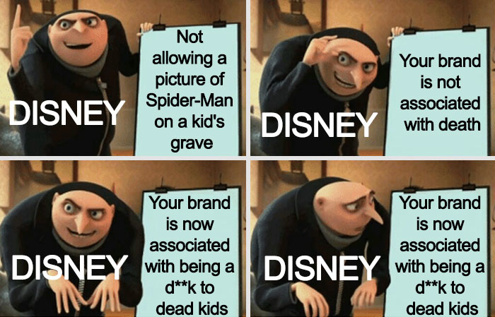 Disney’s dedication to protecting its brand, even if it means breaking the hearts of a grieving family, struck many on social media as a cruel gesture. Reddit users responded by trashing Disney with memes.