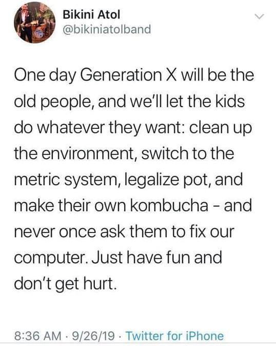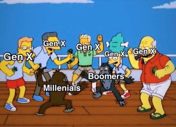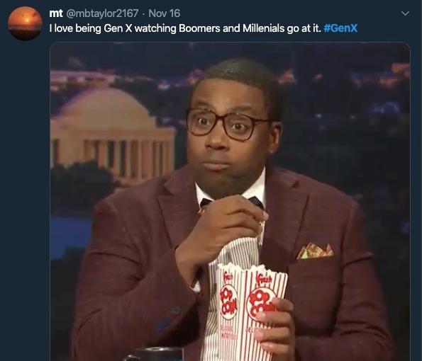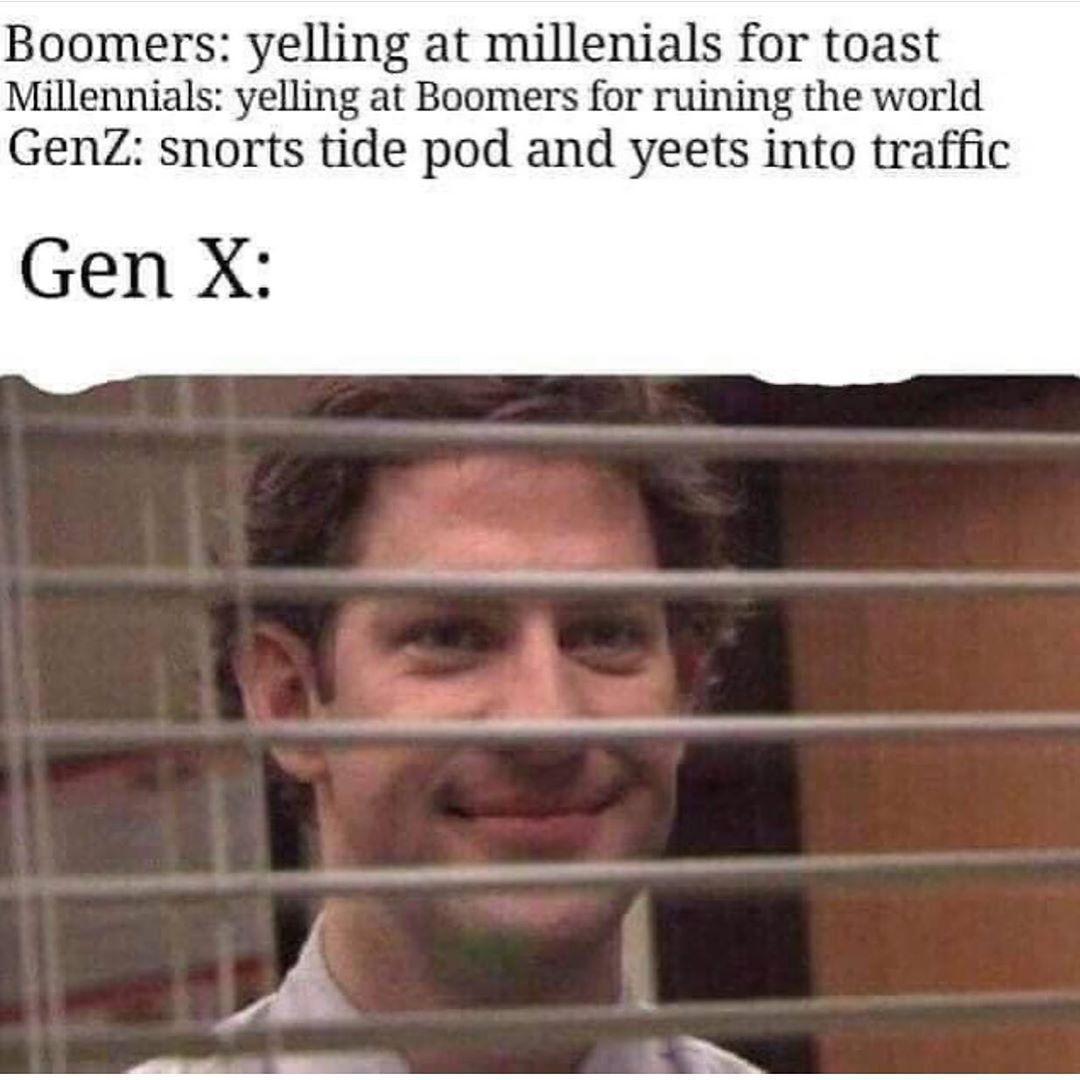 Most of my Gen X friends have Gen Z kids and they are intergenerationally very chill with each other. However, Gen X is the generation most likely to have Boomer parents and younger millennial kids, and this meme seems to be resonating a bunch with Xers of a certain age.