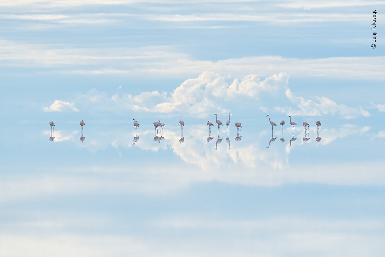 Japanese photographer Junji Takasago apparently had to fight back altitude sickness as he captured a group of Chilean flamingos preening high up in Bolivia’s Salar de Uyuni, the world’s largest salt pan, also known as the “mirror in the sky” for its high-definition reflections.
