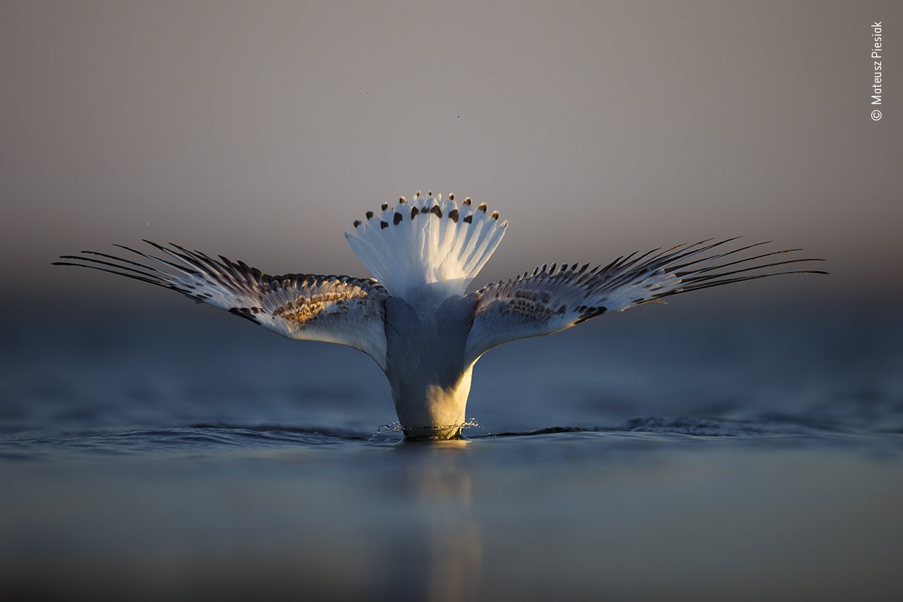 It took photographer Mateusz Piesiak several attempts to “nail the focus” to bring an intimate glimpse of a young gull’s high-speed dive right at the moment of impact with the water. But the results were worth it.