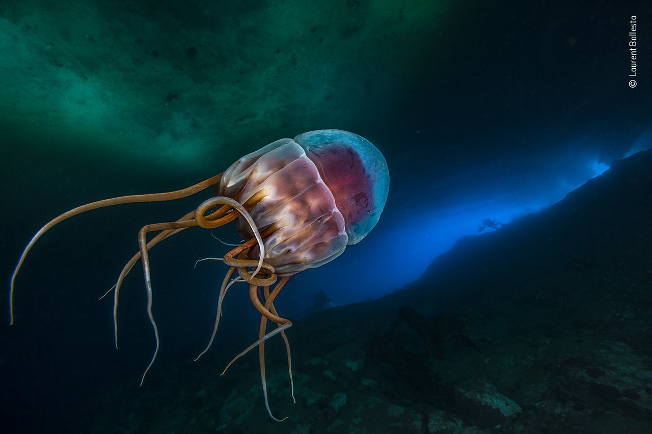 Exposure to direct sunlight is lethal for a helmet jellyfish, forcing it to stay in darkness well beneath thick sheets of ice. Photographer Laurent Ballesta and his team had to seep in light from safe distances to capture this bioluminescent creature.