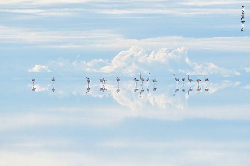Heavenly flamingos | Wildlife Photographer of the Year | Natural History MuseumJapanese photographer Junji Takasago apparently had to fight back altitude sickness as he captured a group of Chilean flamingos preening high up in Bolivia's Salar de Uyuni, the world’s largest salt pan, also known as the “mirror in the sky” for its high-definition reflections.