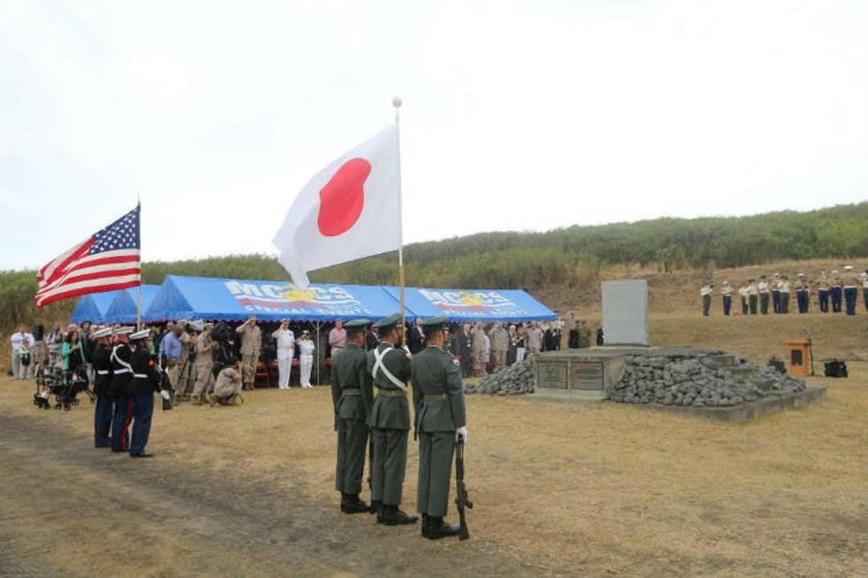 A memorial service is held between both American and Japanese service members on the anniversary of one of World War II's bloodiest battles in March 2015. Photo by STR/AFP/Getty Images.
