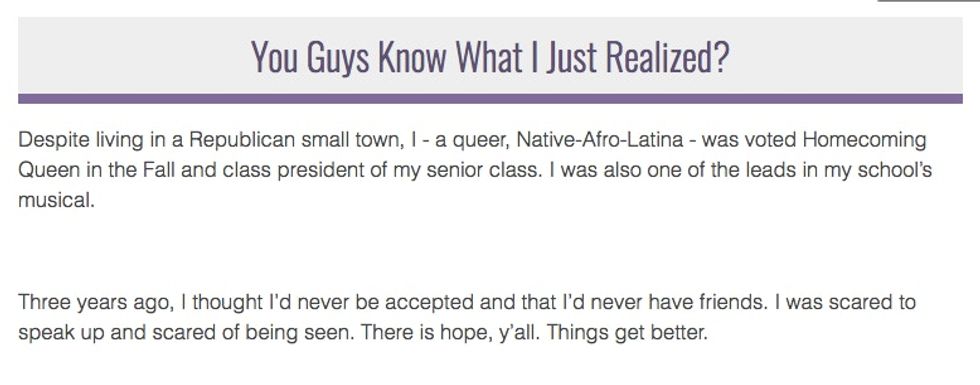 "You guys know what I just realized? Despite living in a Republican small town, I — a queer, Native-Afro-Latina — was voted Homecoming Queen in the fall and class president of my senior class. I was also one of the leads in my school's musical. Three years ago, I thought I'd never be accepted and that I'd never have friends. I was scared to speak up and scared of being seen. There is hope, y'all. Things get better."