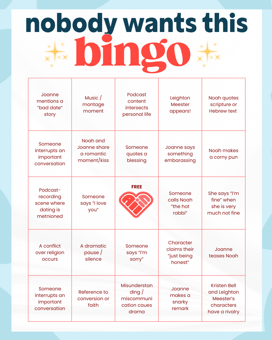 You might’ve heard of Kristen Bell’s wildly popular show “Nobody Wants This,” where she plays Joanne, a snarky LA podcaster, who falls in love with Noah, a young “hot” rabbi (played by Adam Brody). Some fans are going All In on getting ready for Season 2, which is released on Netflix on October 23. The snack bar company, All In Food, is prepping people for their watch parties by releasing a bingo card, where fans can fill out the most iconic character moments as they occur. Another thing All In Food goes all in on? Free bars. You can get the best sweet treat at Sprouts. Try one from the Sprouts “New For You Destination” for free today!
