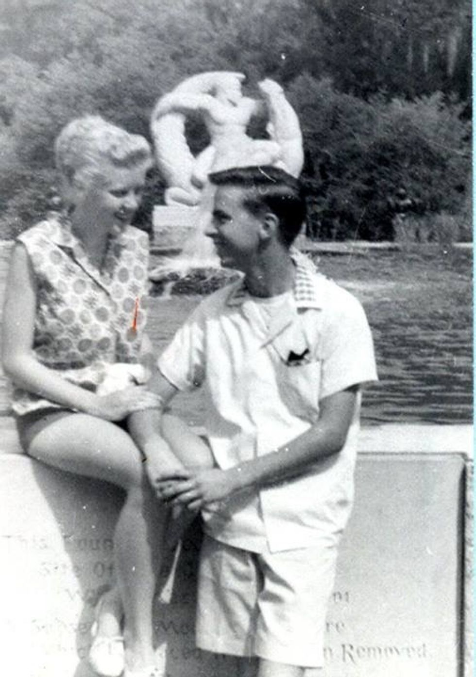 Ginger and George first met in a restaurant booth in 1958, where they'd been seated together by coincidence. They barely spoke to one another that day. A couple of months later, they saw each other at a stoplight, where George honked at Ginger and waved. She recognized him from the restaurant, and his smile lingered in her mind. The third time they met, Ginger's brother introduced her to George at the county fair—the two men just happened to have been classmates. A week later, Ginger came home from a date to find George in her family's living room, hanging out with her brother and his wife. They all went out to a late night diner together, and from then on the two were hooked.