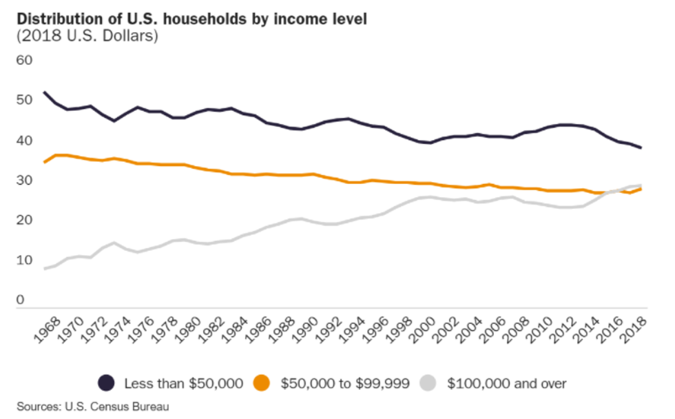 According to the most recent data from the U.S. Census Bureau, in 2018, more than 30% of U.S. households earned over $100,000 (i.e., the upper class). Fewer than 30% of households earned between $50,000 and $100,000 (i.e., the middle class). The share of U.S. households making at least $100,000 has more than tripled since 1967, when just 9% of all U.S. households earned that much (all figures are adjusted for inflation).