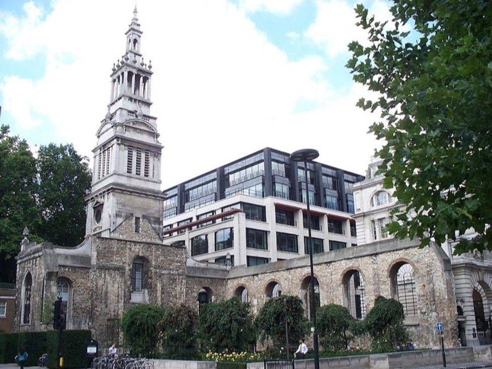 Christ Church Greyfriars, a church in London that stands in the shadow of St. Paul's Cathedral, is still a skeleton of its former self. Only a bombed-out wall and recently restored steeple remain.