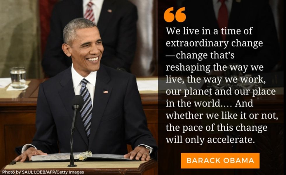 "We live in a time of extraordinary change — change that’s reshaping the way we live, the way we work, our planet and our place in the world. It’s change that promises amazing medical breakthroughs, but also economic disruptions that strain working families. It promises education for girls in the most remote villages, but also connects terrorists plotting an ocean away. It’s change that can broaden opportunity, or widen inequality. And whether we like it or not, the pace of this change will only accelerate.