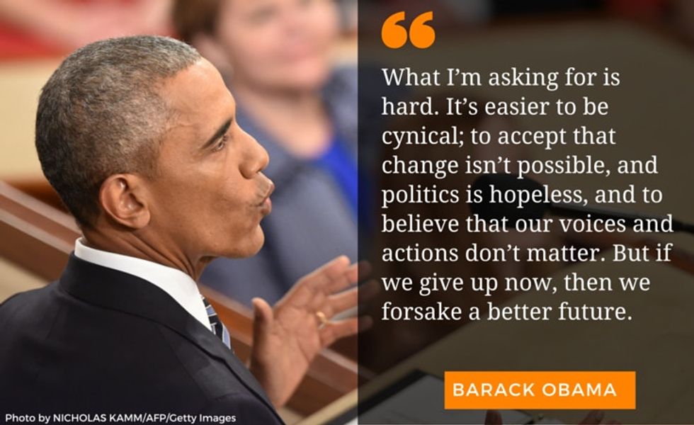 "What I’m asking for is hard. It’s easier to be cynical; to accept that change isn’t possible, and politics is hopeless, and to believe that our voices and actions don’t matter. But if we give up now, then we forsake a better future. Those with money and power will gain greater control over the decisions that could send a young soldier to war, or allow another economic disaster, or roll back the equal rights and voting rights that generations of Americans have fought, even died, to secure. As frustration grows, there will be voices urging us to fall back into tribes, to scapegoat fellow citizens who don’t look like us, or pray like us, or vote like we do, or share the same background.