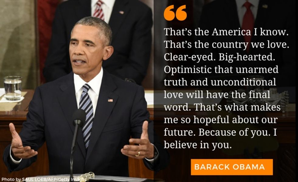 It's here that the president touches on some of his administration's big accomplishments — namely, the health care law, action taken to make the country less dependent on fossil fuels, and the Supreme Court's historic marriage equality ruling — holding them up as shining examples of progress. It's all part of the same larger story of who we are as a country.