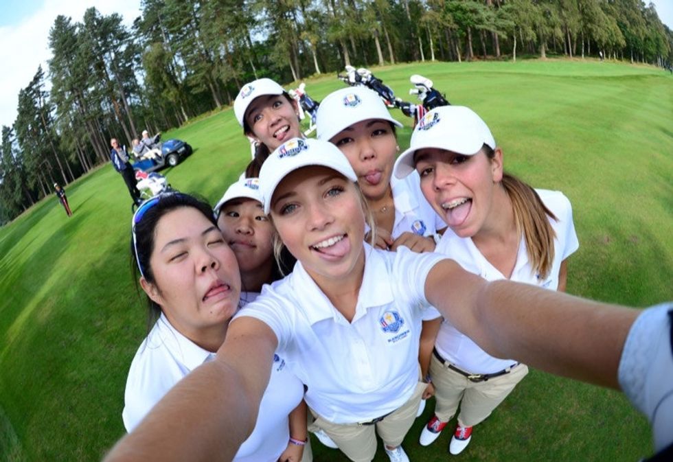 Golfer Sierra Brooks takes a selfie with her teammates Amy Lee, Andrea Lee, Kristen Gillman, Bethany Wu, and Hannah O'Sullivan during a practice round at the 2014 Junior Ryder Cup. Photo via Getty Images.
