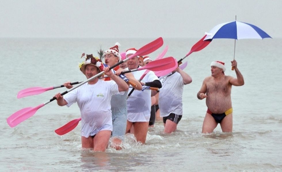 What are these people doing? Why does that one guy have an umbrella? Did they survive a pink kayak disaster or is this some kind of ritual sea-bath in Northern France? The world may never know, but you and I and the rest of America can rest assured that we agree — there are no two ways about it — this is a bizarre picture.