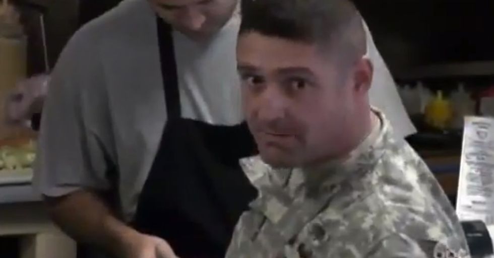 Narrator: A member of the U.S. Army steps up to the counter.