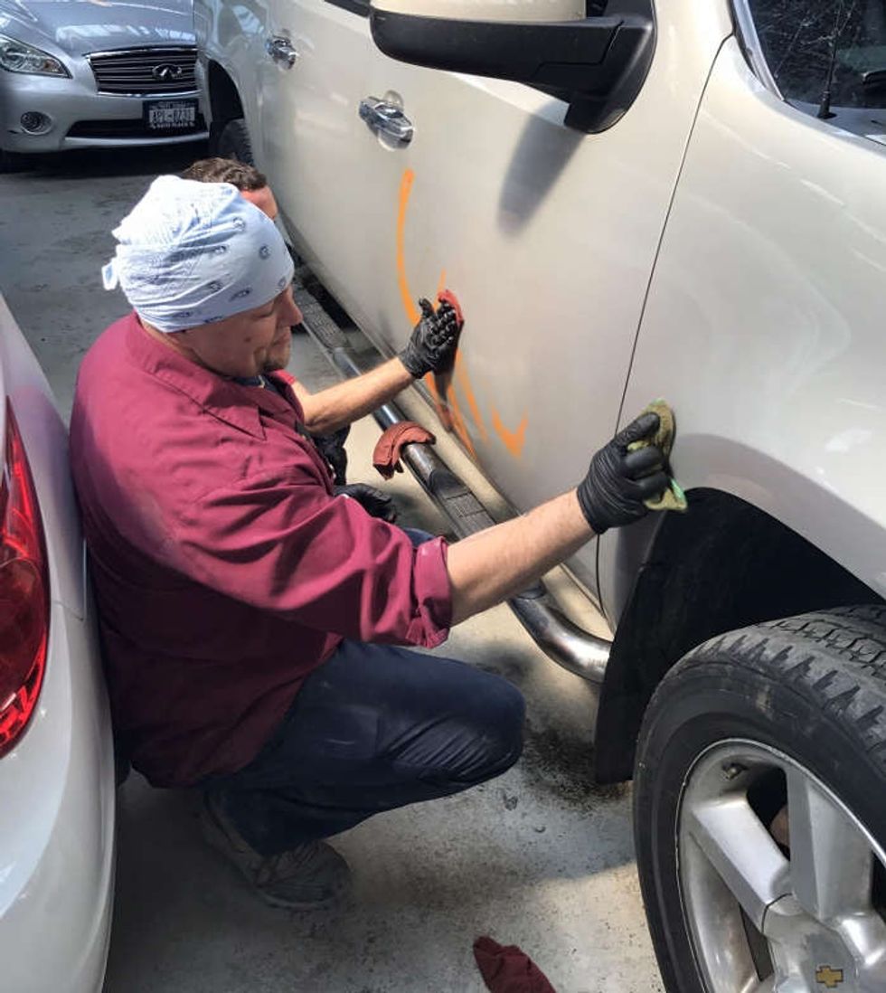 After finding the right chemical to remove the paint, seven or eight of the shop's technicians worked on the truck until the graffiti was removed, according to Todaro.