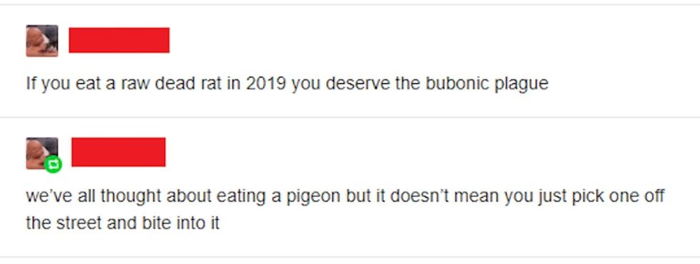 "If you eat a raw dead rat in 2019 you deserve the bubonic plague," the original Tumblr user wrote. "We've all thought about eating a pigeon but it doesn't mean you just pick one off the street and bite into it."