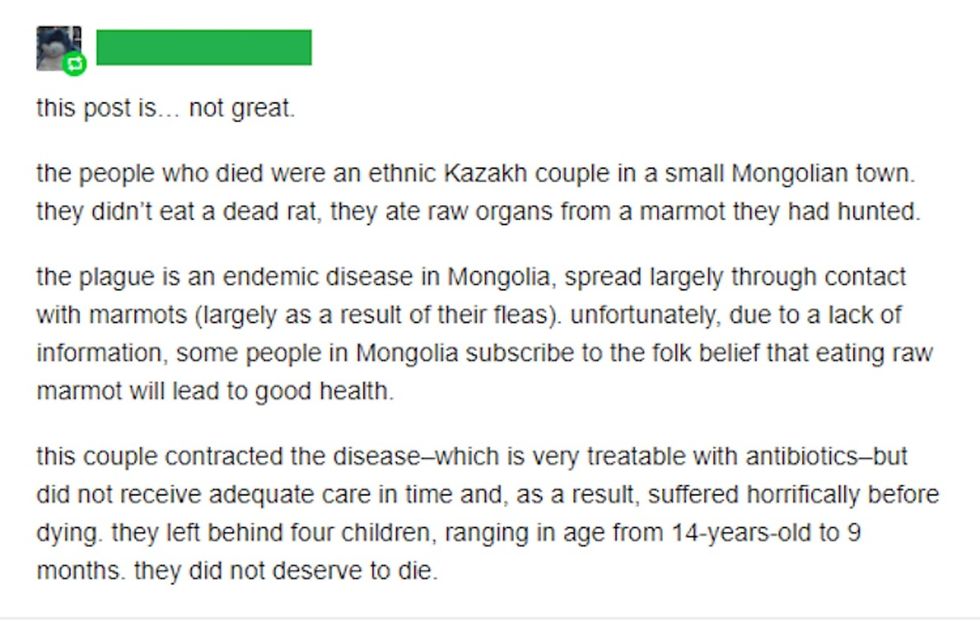 "The people who died were an ethnic Kazakh couple in a small Mongolian town," the user wrote. "They didn't eat a dead rat, they ate raw organs from a marmot they had hunted.the plague is an endemic disease in Mongolia, spread largely through contact with marmots (largely as a result of their fleas). unfortunately, due to a lack of information, some people in Mongolia subscribe to the folk belief that eating raw marmot will lead to good health."