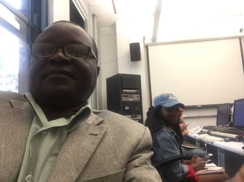 So Enock stayed put. At his daughter's school. And went to class with her.