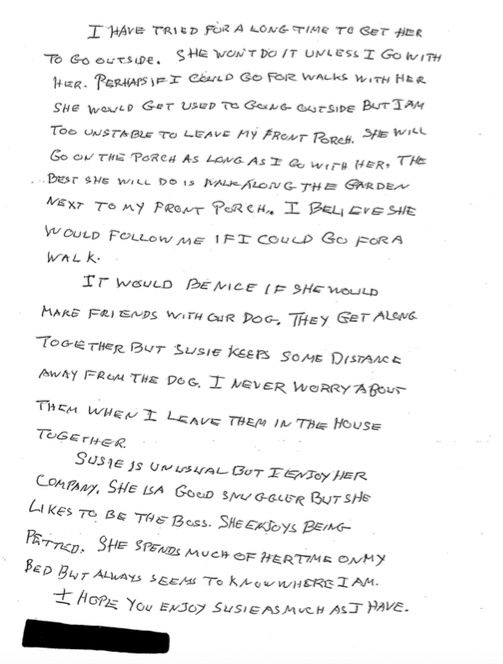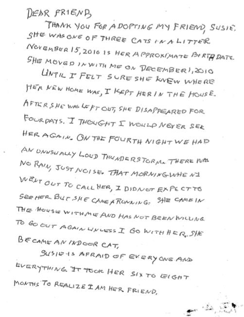 “I’m sure that when she wrote it, she wrote it just to the intent of getting it to the adopter,” said Katherine Zenzano, community outreach coordinator of Montgomery County Animal Services and Adoption Center, said according to ABC News. “But we realized Susie was wasn’t going anywhere. Some cats are really great at selling themselves and Susie wasn’t selling herself.”